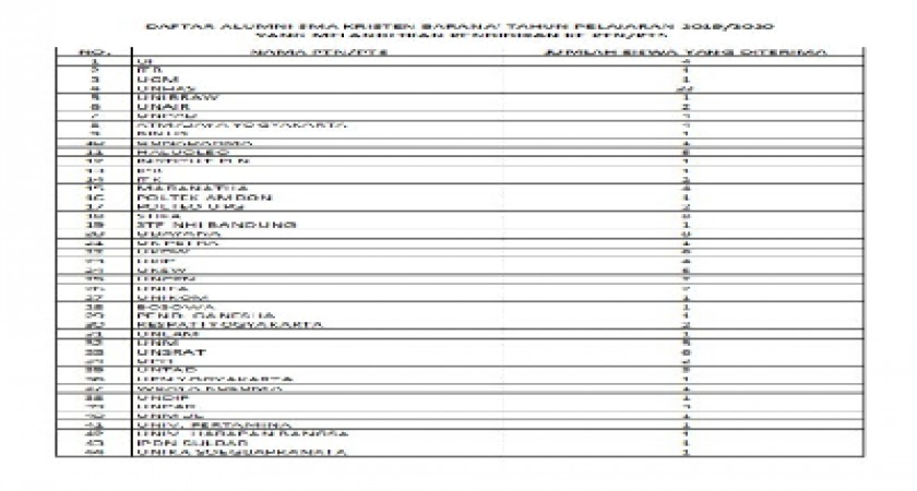 Sesuai data yang diterima oleh Humas, ada 138 siswa yang melanjutkan pendidikan ke PTN/PTS tahun pelajaran 2019/2020. SMA Kristen Barana' mengucapkan selamat atas hasil yang telah diraih dan sukses selalu.